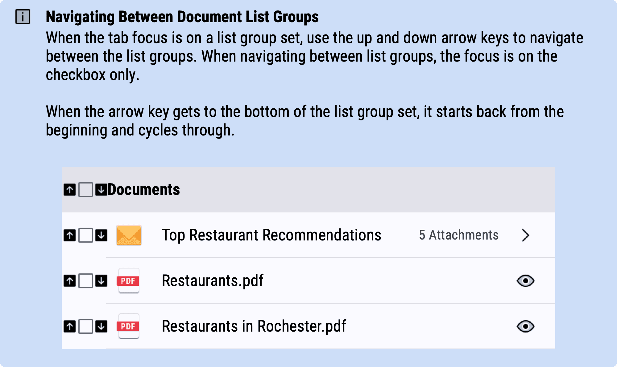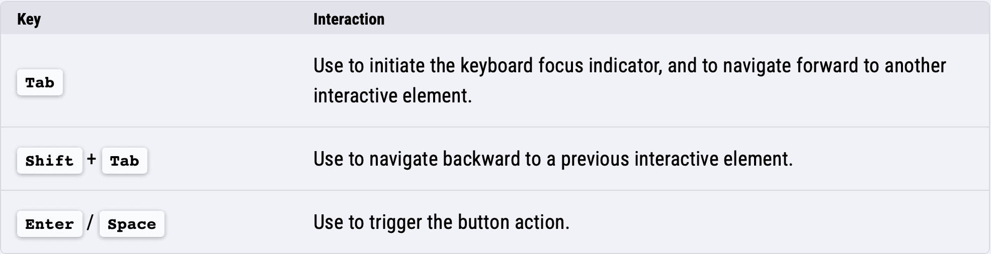Shown below, I added snippets to parts of the spec that call out information regarding accessibility requirements. And unlike before, where accessibility was scattered throughout the application, I aggregated all of the tips into an accessibility section in the spec that was easy to find for developers.